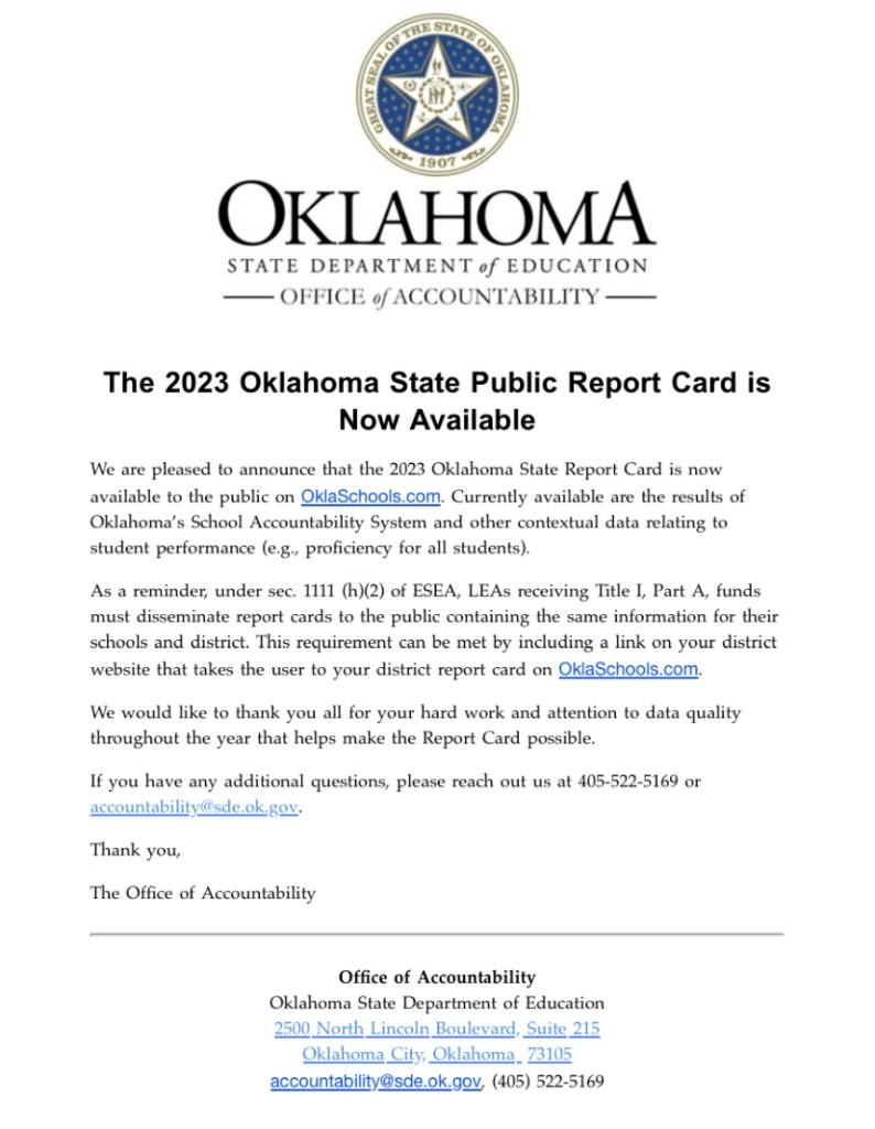 November 16, 2023Web Administrator 2023 Oklahoma State Public Report Card Share this: Share on X (Opens in new window) X Share on Facebook (Opens in new window) Facebook Like Loading... Related
